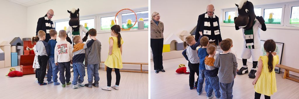 Was macht man mit den roten und grünen Magneten? Wofür ist das Stoppschild da? Und welche Rolle spielt Plüschkatze Kim? Neugierig holten die Kinder einen Gegenstand nach dem anderen aus der großen roten Kiste. Stellvertretend für alle 73 pro multis Kindertagesstätten durften die Jungen und Mädchen aus der KiTa Himmelsschaukel die beiden Starke-Kinder-Kisten entgegennehmen – zur Freude aller von keinem Geringeren als Borussia-Maskottchen Jünter.