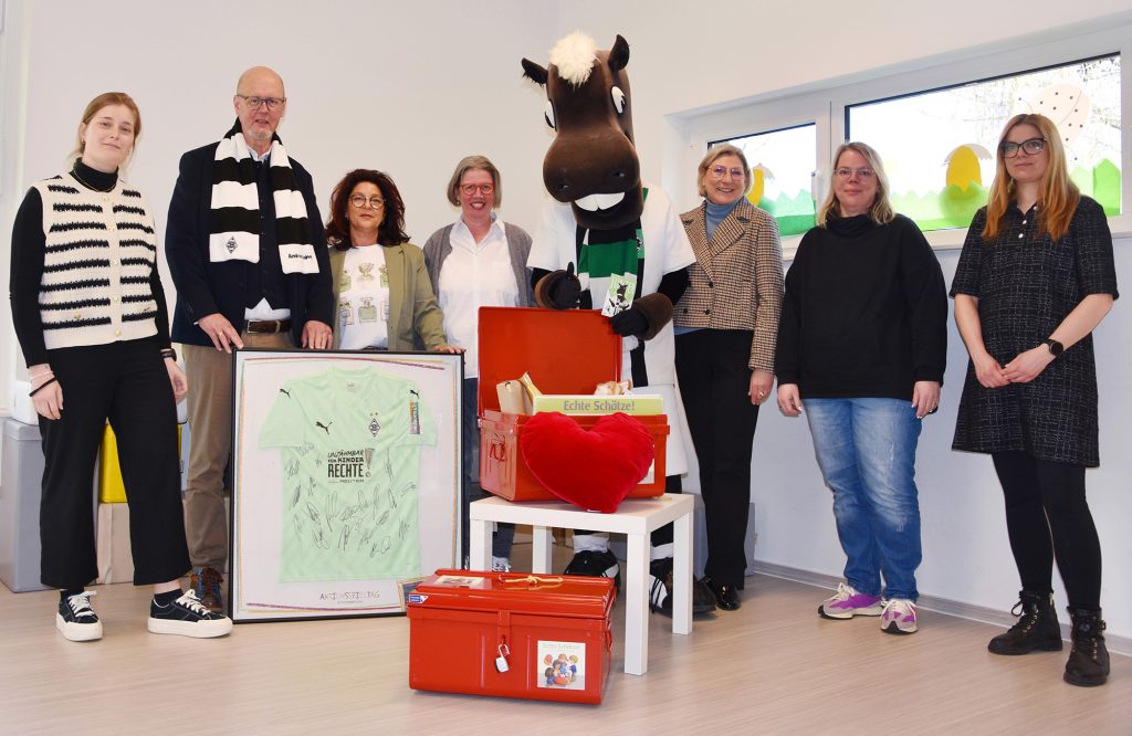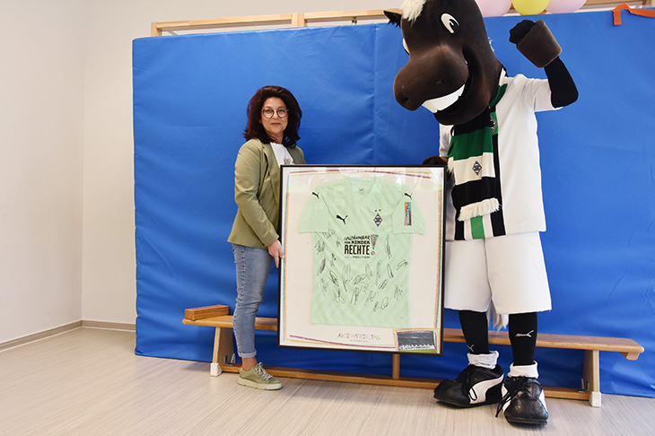 Neben dem Besuch von Jünter, der von Andreas Heinen, Vorstandsmitglied der Borussia Stiftung, und Anna Froneberg, Stabstelle CSR & Nachhaltigkeit, begleitet wurde, durften sich die Jungen und Mädchen aus der Himmelsschaukel über ein weiteres Geschenk freuen: ein Fußballtrikot von Borussia Mönchengladbach mit den Unterschriften aller Spieler. „Was für eine schöne Überraschung!“, freut sich Gebietsleiterin Petra Zeleznik. „Das Trikot erhält bei uns in der Himmelsschaukel definitiv einen Ehrenplatz.“