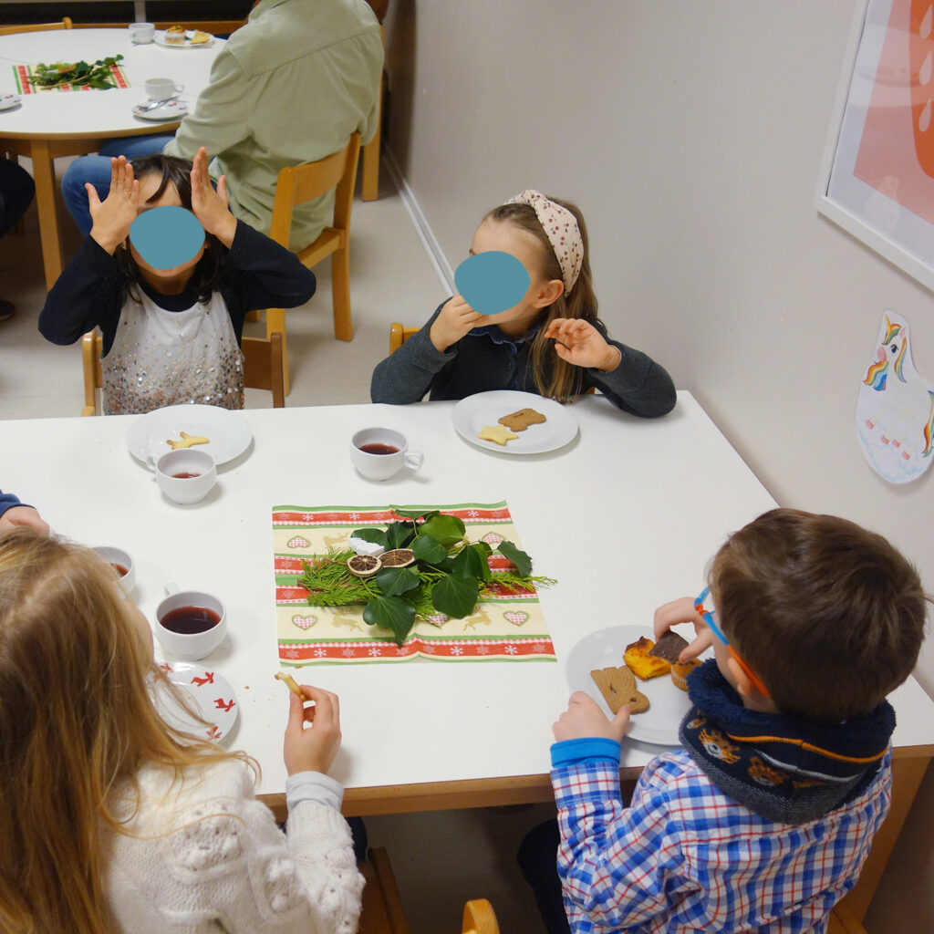 Der Duft von Weihnachtsplätzen liegt in der Luft. Mit großer Freude und unter strengster Geheimhaltung basteln die Kinder Geschenke für ihre Familien. Glitzernde Sterne, flauschige Schneeflocken sowie Weihnachtsmänner, Rentiere und Engel in allen möglichen Variationen schmücken die Räume. Mit liebevoll gestalteten Krippen spielen die Kinder die Weihnachtsgeschichte nach. Adventskoffer mit kleinen Überraschungen wandern von Familie zu Familie. Klassiker wie „Jingle Bells“ und „In der Weihnachtsbäckerei“ sorgen für anhaltende Ohrwürmer. Und noch so vieles mehr.